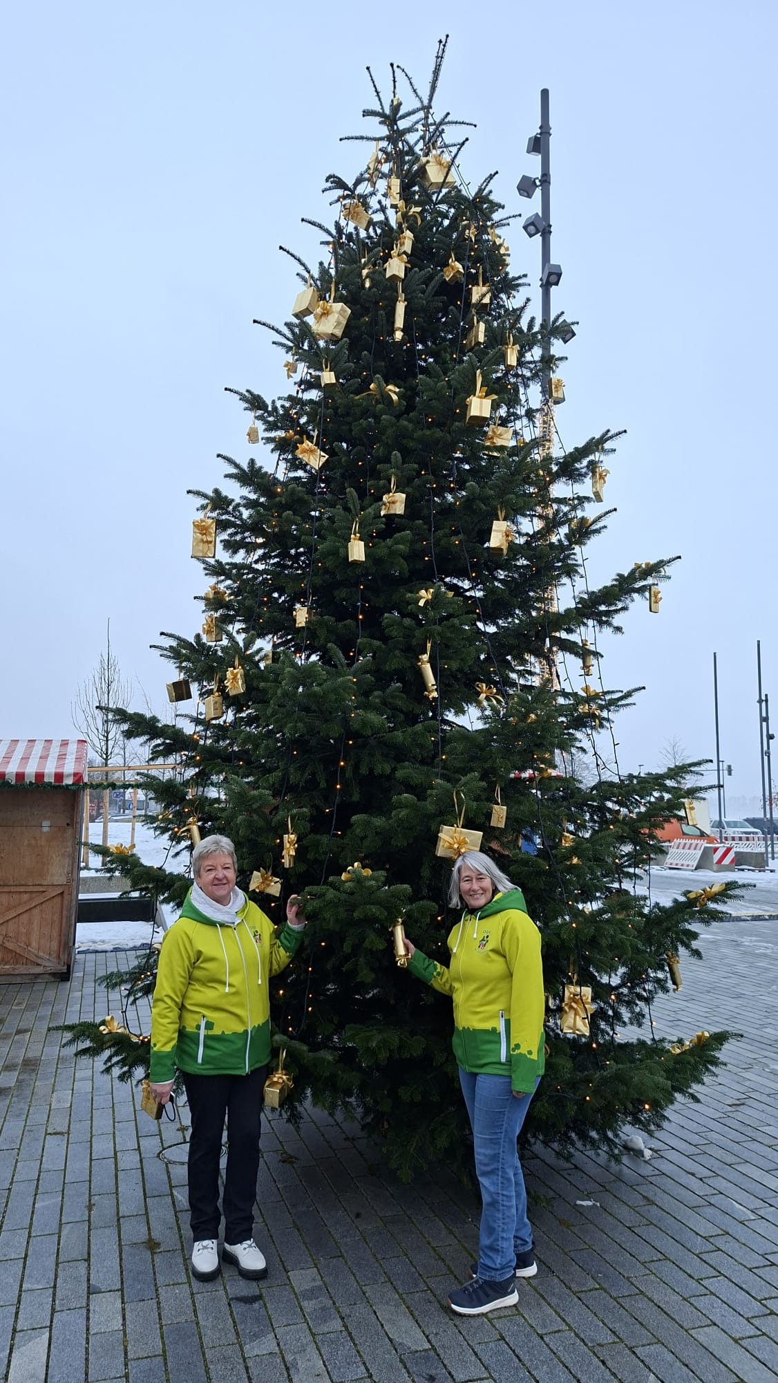 Der Kaufpark spendete eine Tanne für den Neutraublinger Christkindlmarkt, die dann von Annemarie Burgemeister und Martina Martin mit goldenen Päckchen dekoriert wurde.
